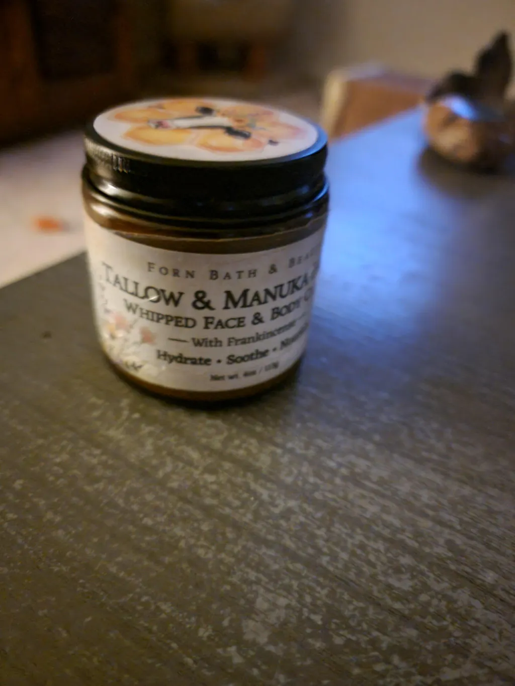 Indulge your skin with the luxurious nourishment of our Tallow & Manuka Honey Face & Body Cream, a rich, whipped blend crafted from nature’s most restorative ingredients. Made with grass-fed, grass-finished tallow, this cream deeply hydrates and supports your skin’s natural barrier, leaving it soft, supple, and glowing.  Handmade with Love, Joy, & a little Magick.